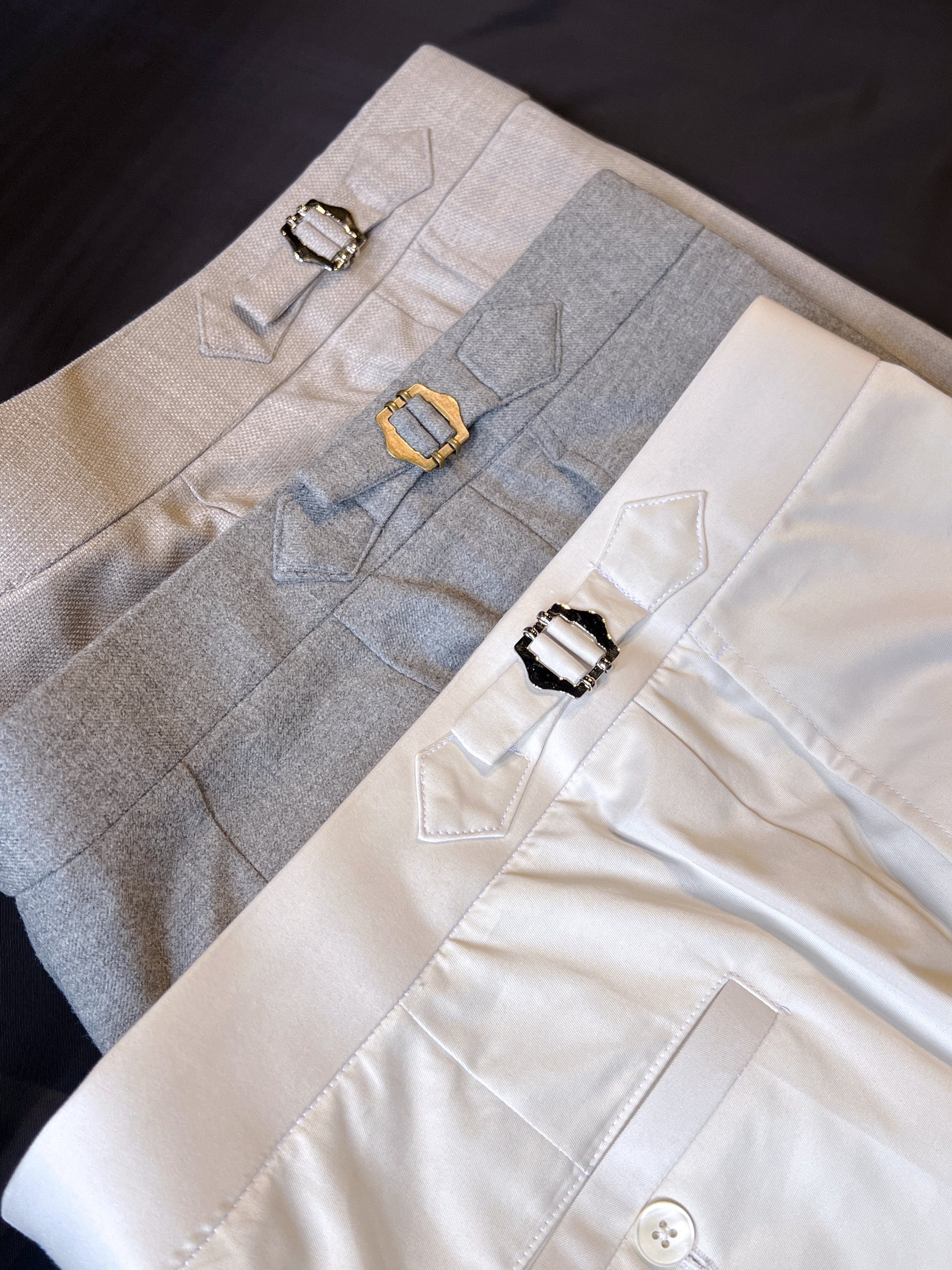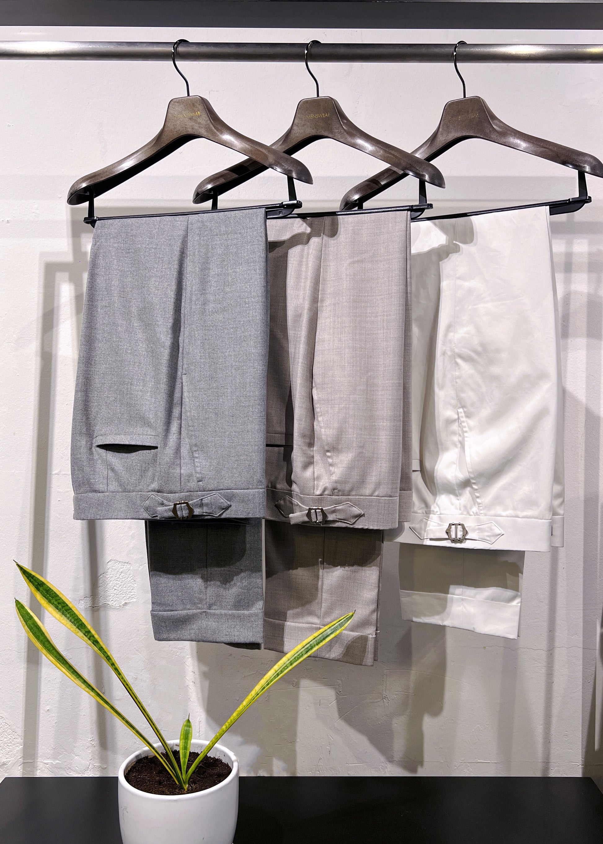 Step into style and comfort with our bespoke smart casual trousers. Crafted for the modern professional, these tailored trousers are available in a refined palette of white, warm grey and light grey that complement any wardrobe and occasion.