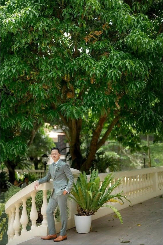The Solaro green hue captures the essence of nature, ideal for outdoor ceremonies. The stylish peak lapel adds a modern twist. Thoughtfully chosen wooden buttons enhance the natural theme of the wedding while beautifully complementing the beige waistcoat.