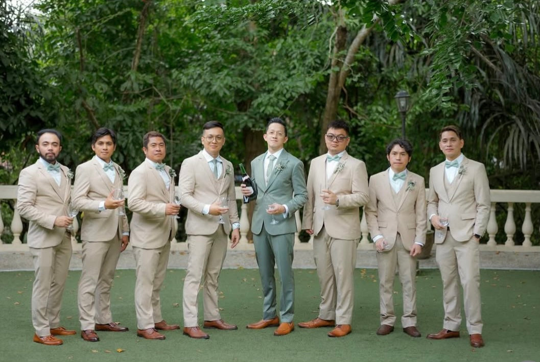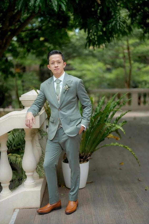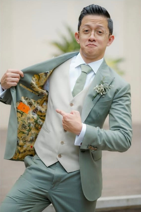 Transform your special day with our bespoke 3 pcs solaro green suit. John resplendent in a rich Solaro green suit paired with a stylish beige waistcoat and crisp white shirt.
