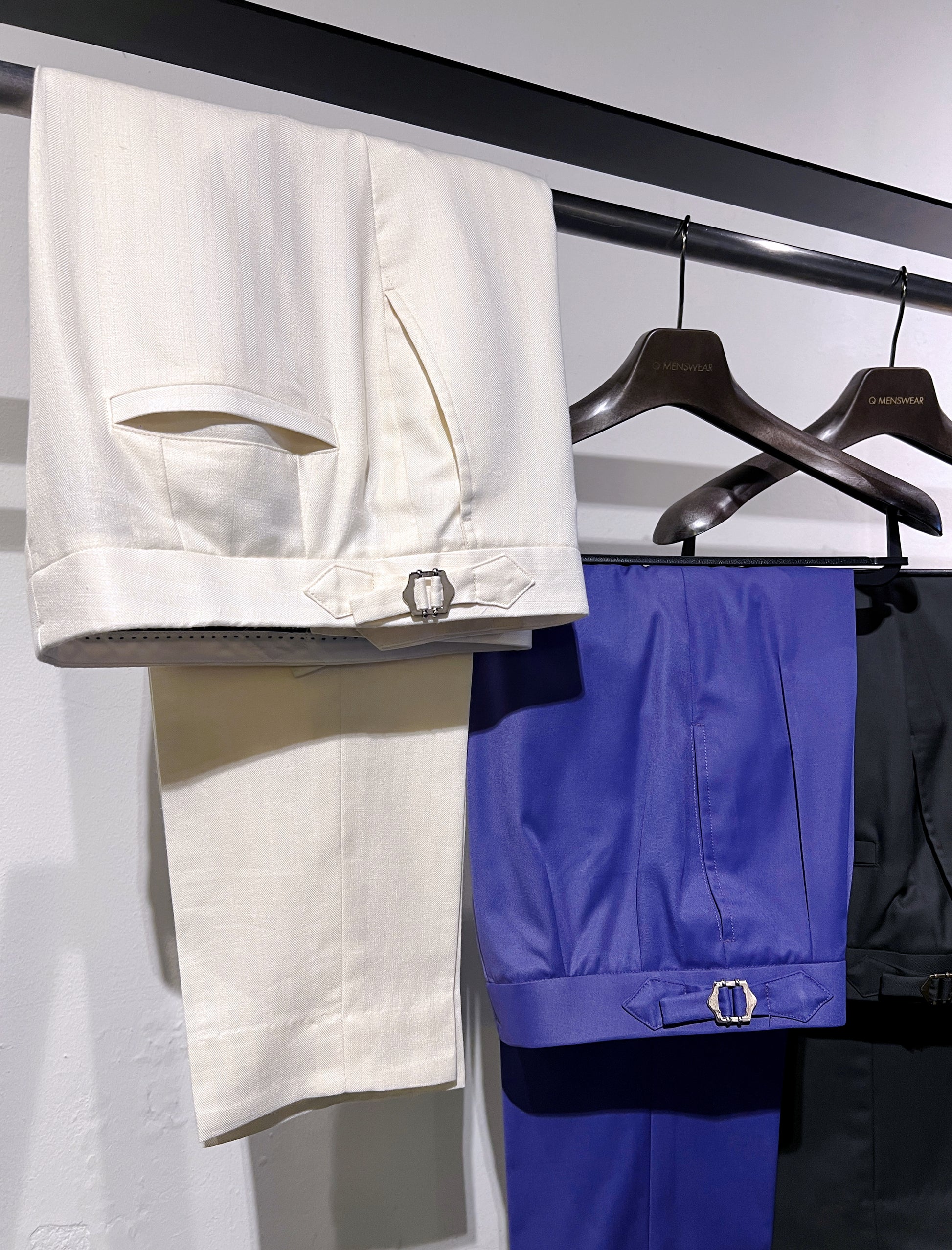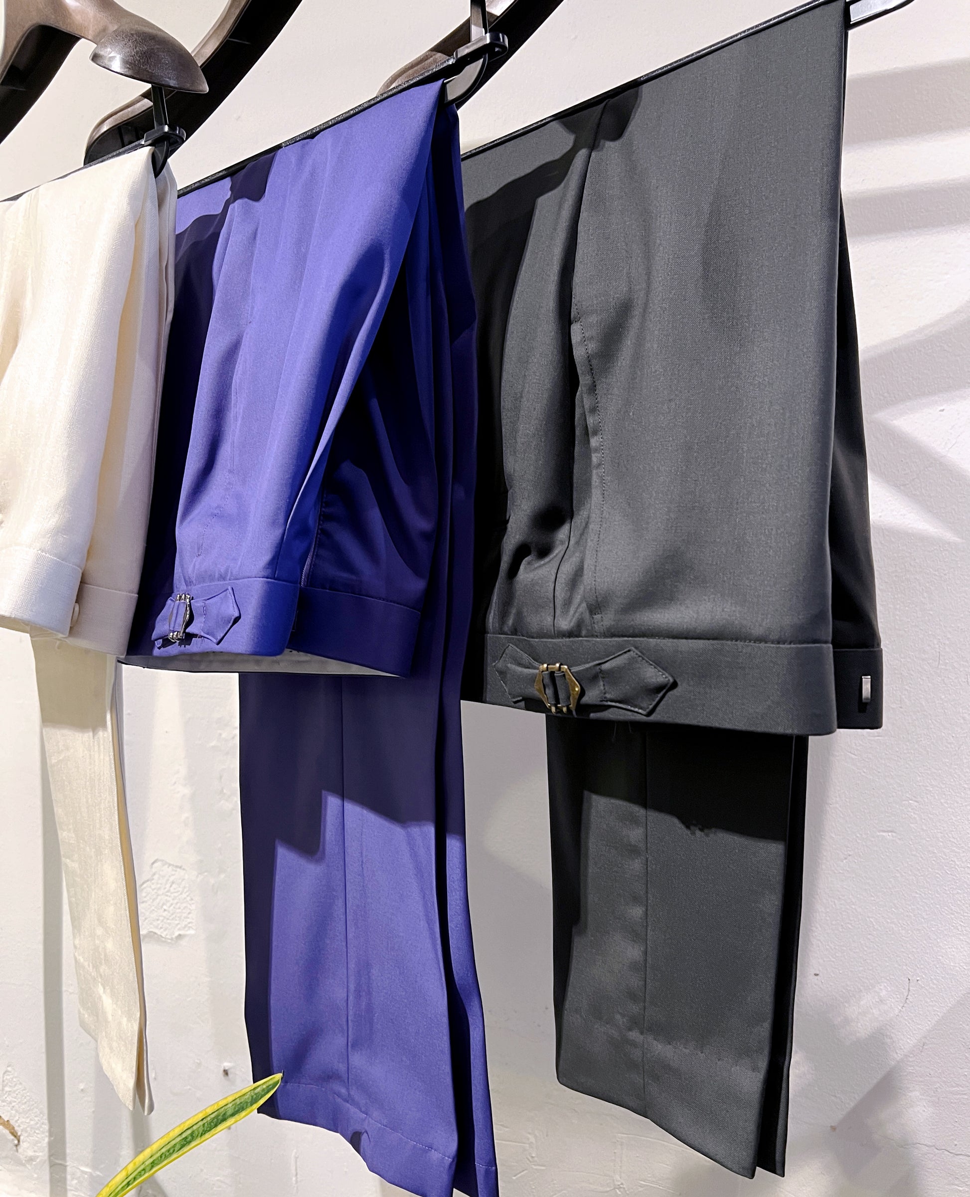 Discover the perfect blend of style and versatility with our tailored casual trousers.The white trousers are meticulously crafted from a blend of wool, silk and linen by Loro Piana fabric which offers not just comfort but also a unique texture that adds character to any outfit. The eye-catching purple trousers are perfect for those who love to express themselves through colour while maintaining a casual yet fancy look.For those who appreciate a more classic approach, this charcoal trousers are the ultimate choice.